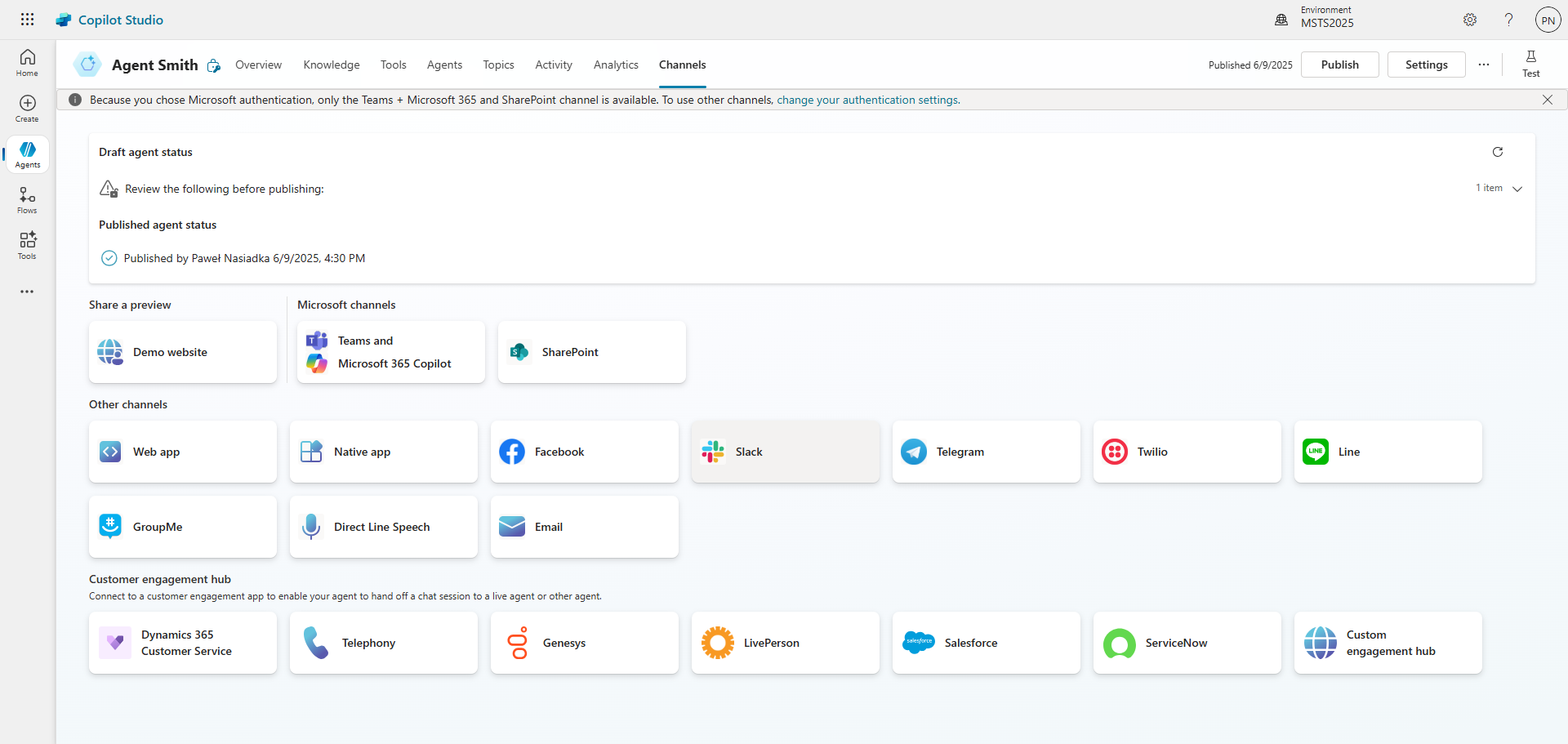 Importantly, Copilot Studio supports both text and voice (IVR) based agents, expanding your reach and accessibility. You can make your agents available for users within your organization, e.g. via Teams or Slack, or add them to external channels such as Facebook, your website, or even a mobile app.