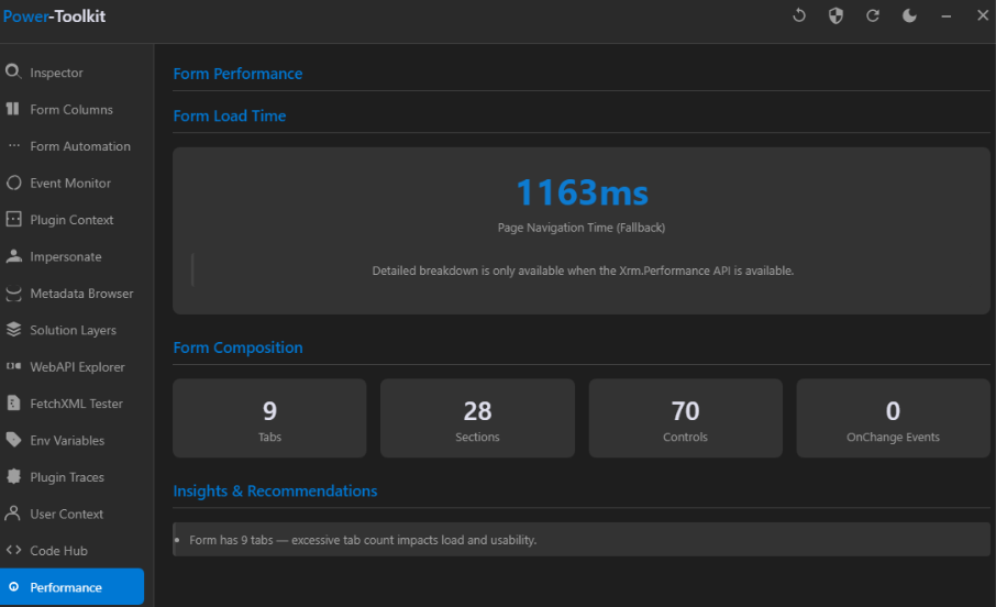 Another useful feature is the form performance analyzer. It shows the total form load time, the number of tabs, sections and controls placed on the form and highlights potential bottlenecks. The tool also provides recommendations on how to optimize and improve form loading experience.