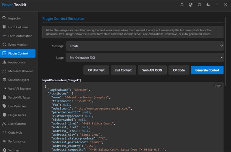 Another thing is the ability to generate full plugin context, including Target and Images. This may be useful when you want to debug scenarios outside Dataverse, for example sending payloads into an Azure Function: