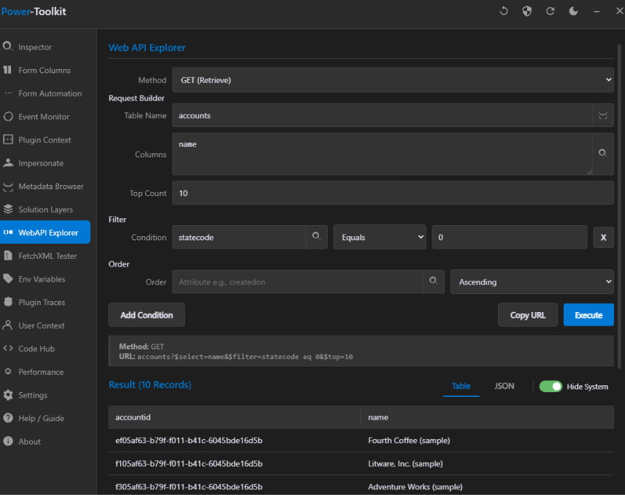Instead of writing requests manually, you select a table, choose the operation and configure parameters. The tool then generates the request for you in multiple formats, including Xrm.WebApi, Xrm.WebApi.execute, FetchXML, jQuery, C#.