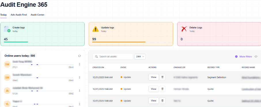 One of its most valuable tools is Audit Engine 365. It extends the standard Audit History but presents it in a more readable format. You can quickly view a daily overview of activity, including which users logged in and when. Each entry shows who made the change, what type of operation it was (Create, Update, Delete), what exactly happened, and includes a link to the record. You can also filter the audit log by any time range.