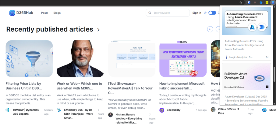 D365Hub also offers a browser extension that makes staying informed even easier. It shows the latest posts (based on your selected preferences) directly in your browser in a clean and simple interface. You see the title, image and link, and if something catches your interest, you can open the full article on the original website.