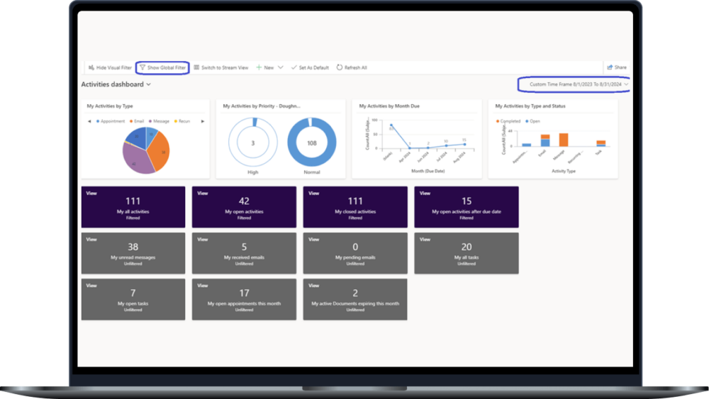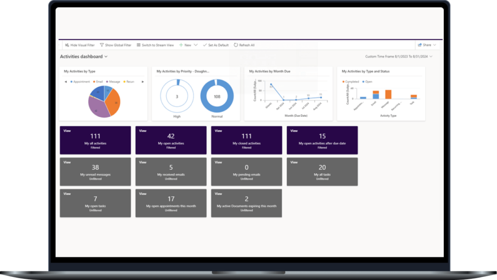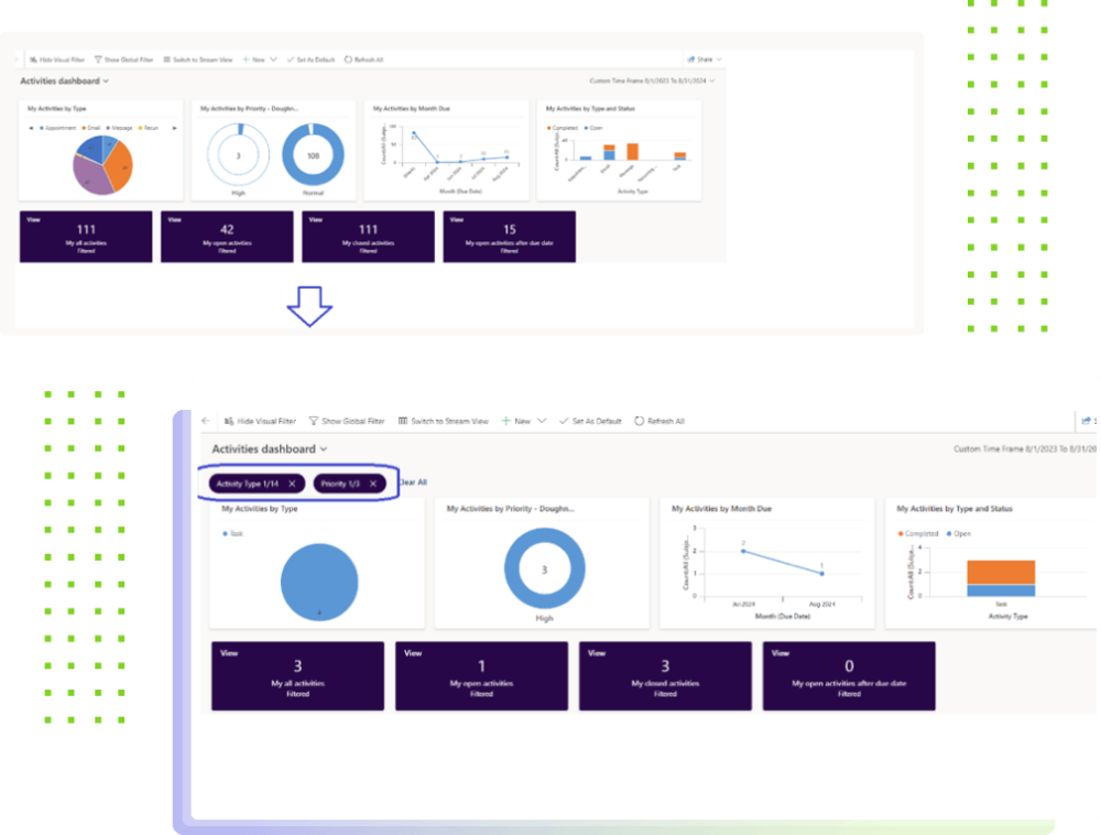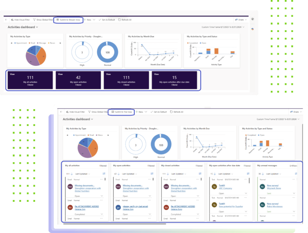 Alternatywne podejście do uzyskiwania wglądu w dane Dataverse w czasie rzeczywistym obejmuje wykorzystanie interaktywnych pulpitów nawigacyjnych. Te pulpity pozwalają użytkownikom filtrować i analizować dane z różnych perspektyw, a jednocześnie zapewniają bezpośredni dostęp do rekordów.