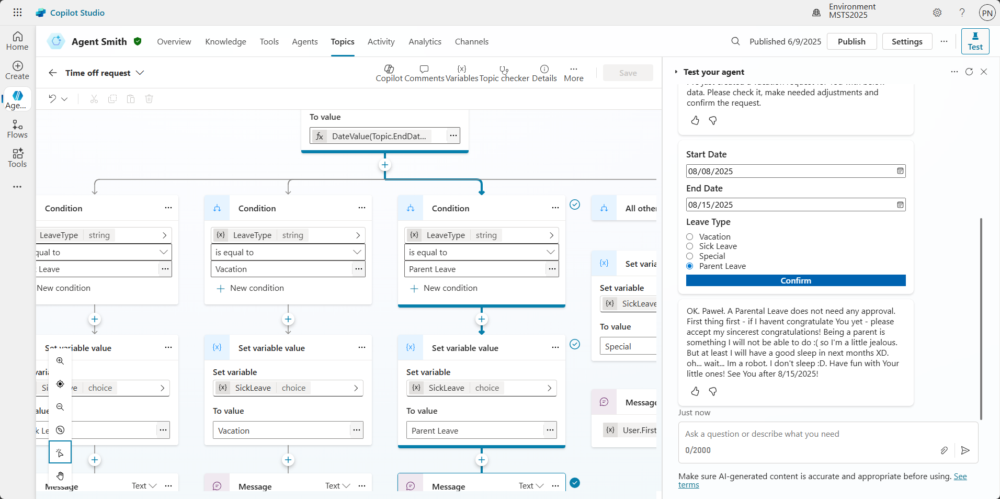 Na koniec warto wspomnieć o Copilot Studio. To nie jest kolejny Copilot, lecz platforma, która umożliwia tworzenie i dostosowywanie Copilotów. Podczas gdy Copiloty są gotowymi asystentami AI tworzonymi przez Microsoft dla konkretnych aplikacji lub zadań, Copilot Studio pozwala budować własnych agentów od podstaw lub rozszerzać istniejące Copiloty Microsoftu.