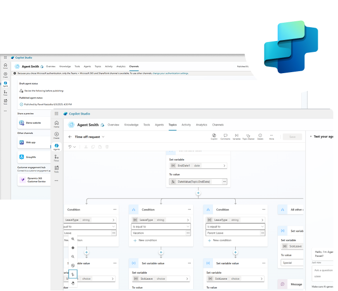 Copilot Studio to platforma, która pozwala tworzyć, zarządzać i wdrażać inteligentnych asystentów dopasowanych do potrzeb Twojej firmy – bez pisania kodu. Zintegruj sztuczną inteligencję z codzienną pracą różnych działów, aby automatyzować zadania, odpowiadać na pytania i poprawiać doświadczenia zarówno klientów, jak i pracowników.