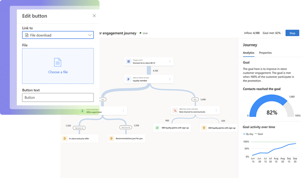 Integruj Customer Insights Journeys z Power BI i Dynamics 365 Sales, by korzystać z pełnego kontekstu danych w jednym miejscu, analizuj wyniki kampanii w Power BI, przekazuj leady bezpośrednio do sprzedaży i reaguj szybciej na potrzeby klientów, dzięki integracji z działem obsługi.