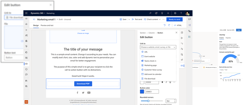 Twórz dopasowane wiadomości e-mail dzięki edytorowi e-mail Customer Insights Journyes, który pozwala dynamicznie wstawiać spersonalizowane dane unikalne dla każdego odbiorcy. Wykorzystaj sugestie treści i obrazów, aby tworzyć angażujące i skuteczne kampanie. -