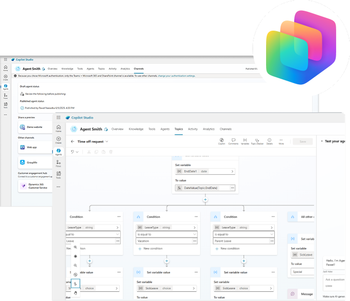 Embed copilots into Teams, Outlook, Dynamics 365, and Power Apps – or any channel your users rely on.