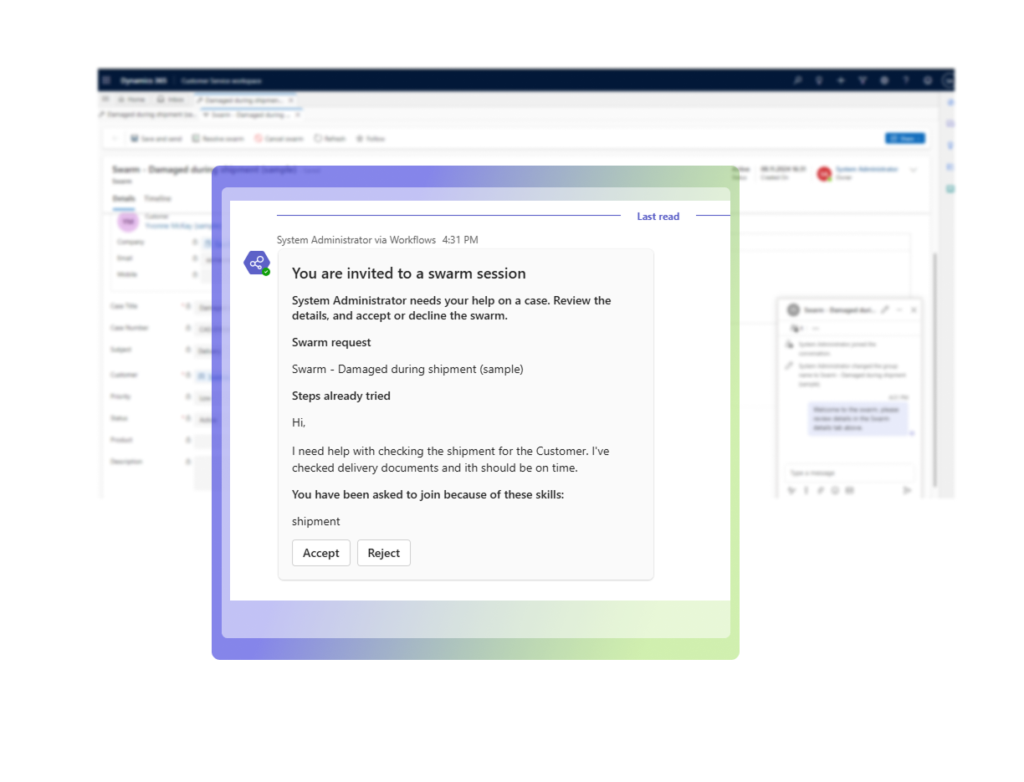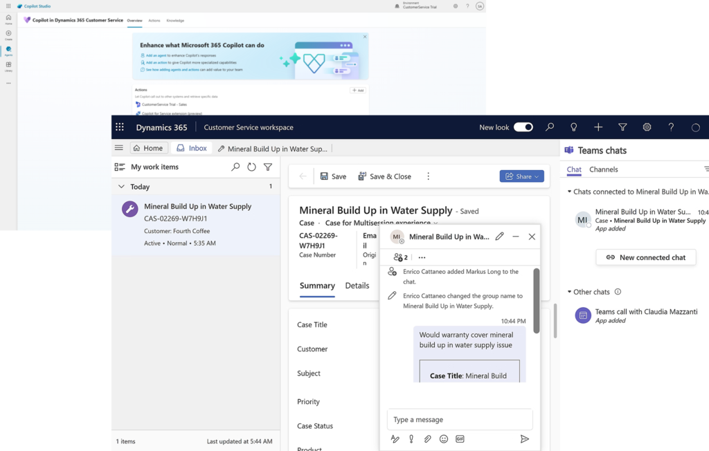 Empower your support agents with AI-driven capabilities in Case Management Agent, which automatically gathers and processes case details during live chats and emails. Reduce handling time with auto-generated summaries, suggested replies, and accelerated case resolution. Enhance team collaboration through intelligent case routing to the right experts and seamless communication via Microsoft Teams chat integration.